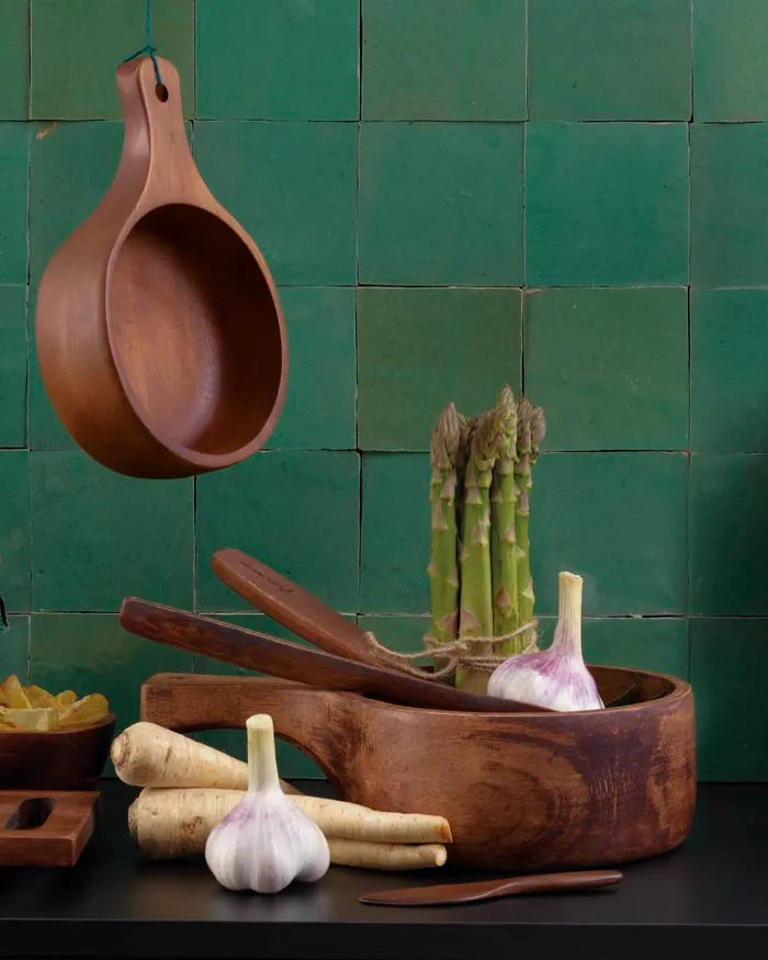 The Wood series offers wooden kitchen utensils that will enhance your table setting. Discover, for example, wooden plates in various sizes made from high-quality acacia wood. The natural look brings a rustic flair to your dining table while also being extremely sophisticated. Wooden items present your food selection beautifully and elegantly. Top them with various cheese or sausage specialties, for example, and put a smile on your guests' faces. Various acacia wood bowls and matching cutlery perfectly complement your dining table. All of these items can be combined with porcelain tableware. If the kitchen accessories from the Wood series are too dark for you, you can also find light-colored wood accessories from our Wood Light series. Here, you can also enjoy cutting boards, trays, and cutlery. Discover wooden kitchen utensils in ASA Selection's extensive kitchen range.